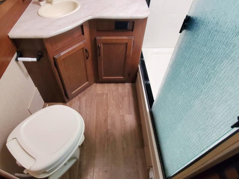 In the rear of the travel trailer, you will find the bathroom. There is a shower with sliding doors, linen cabinet, sink, medicine cabinet, and toilet.