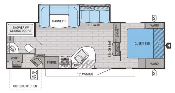 As you enter the travel trailer, to the left is a double kitchen sink, three burner range, microwave, refrigerator, and pantry. The opposite side of the travel trailer offers a u-dinette and a sofa slide. Along the front wall there is an entertainment center and a bench seat.