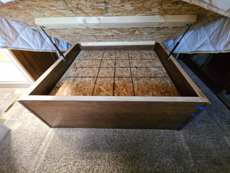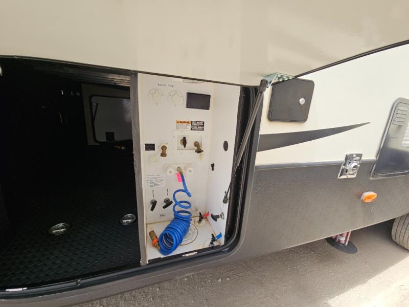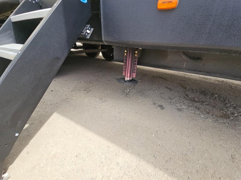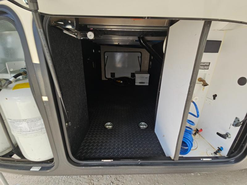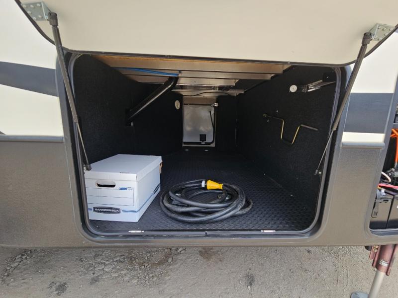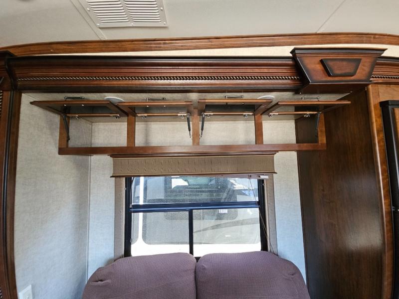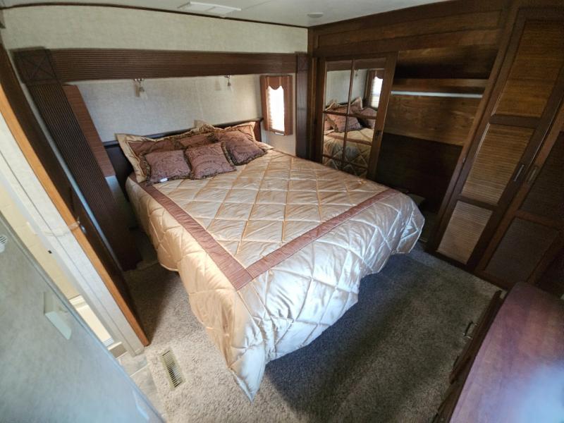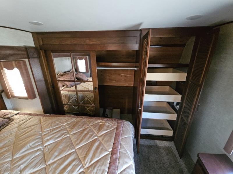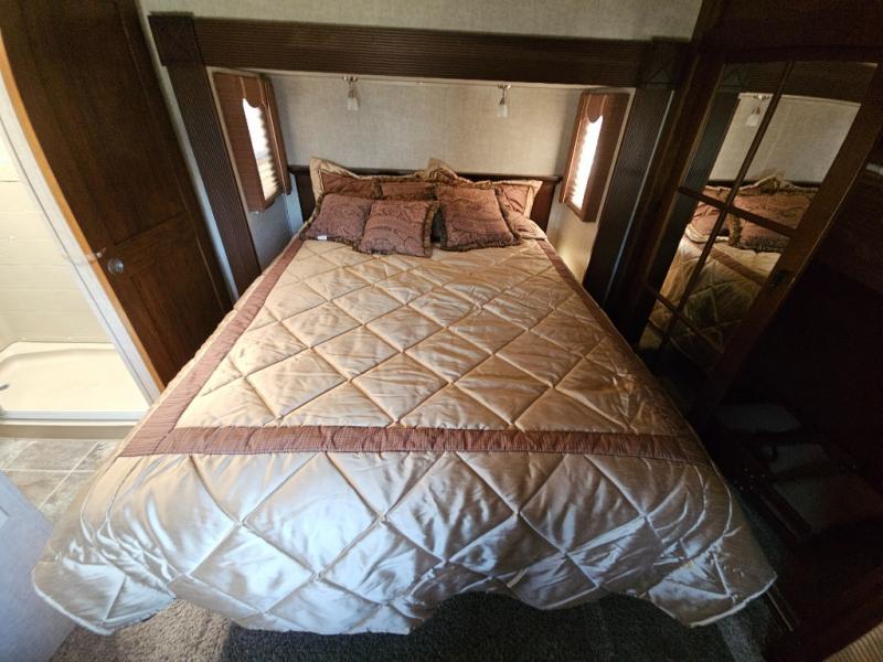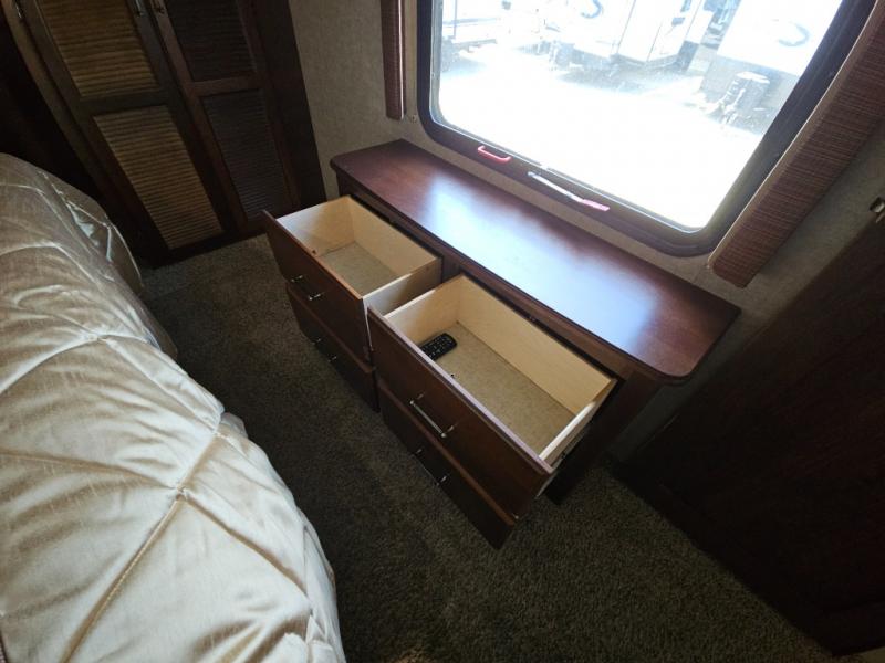 The front private bedroom provides a comfortable place to relax and rest up for the next days adventure. There is a king bed slide, chest of drawers opposite the bed, and front closet with sliding doors, washer and dryer closet with drawers, and so much more!