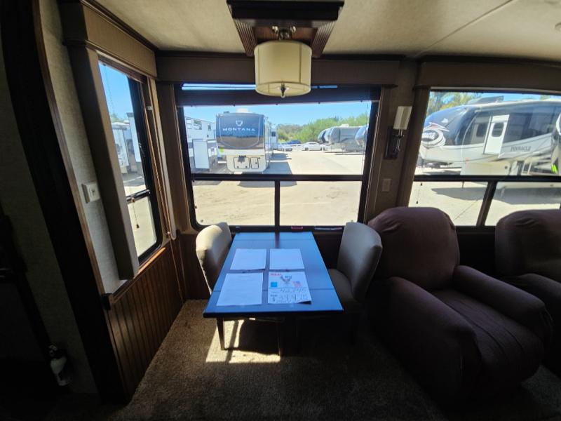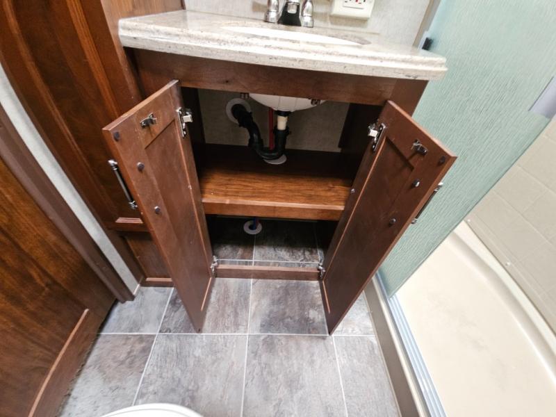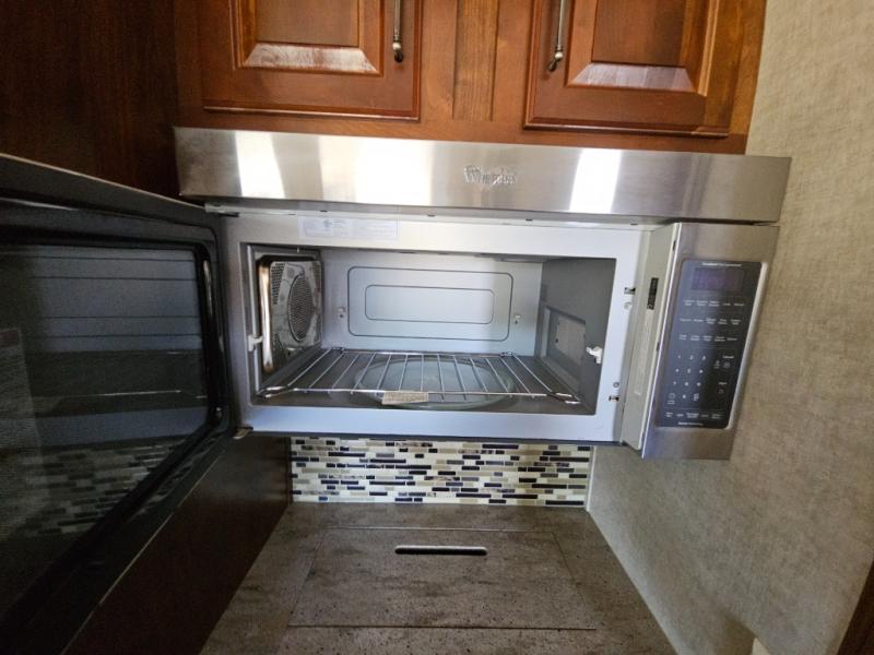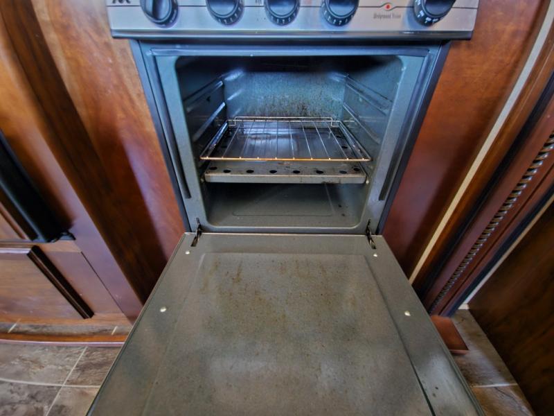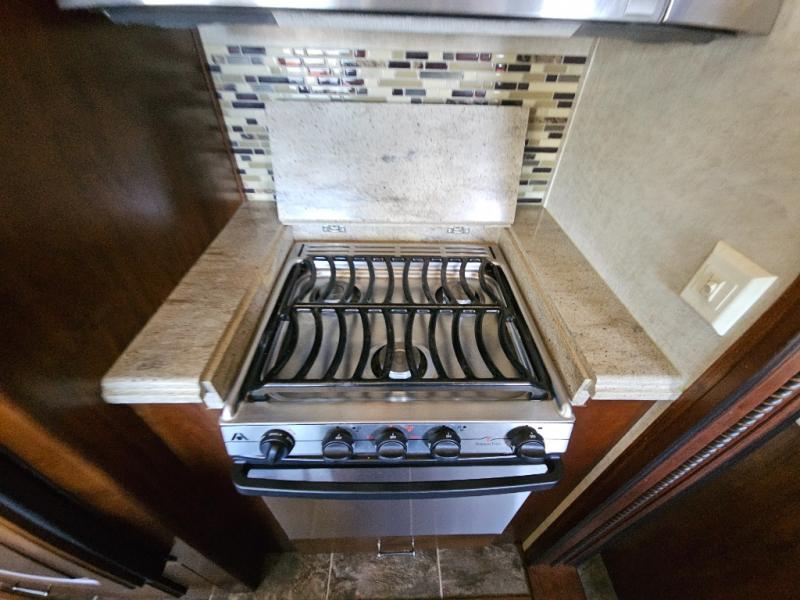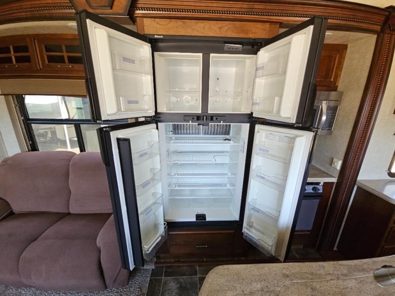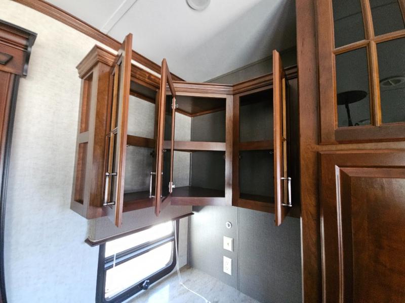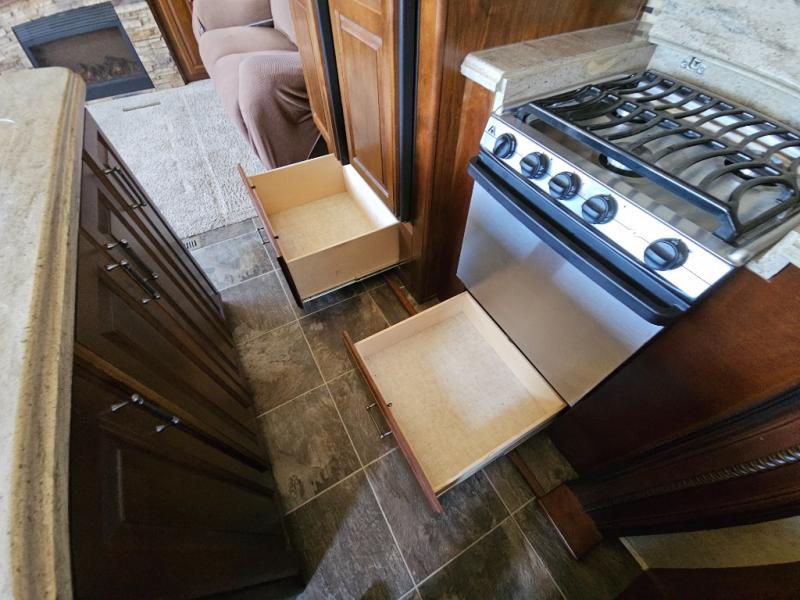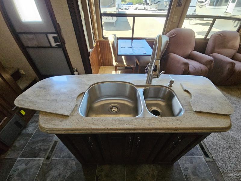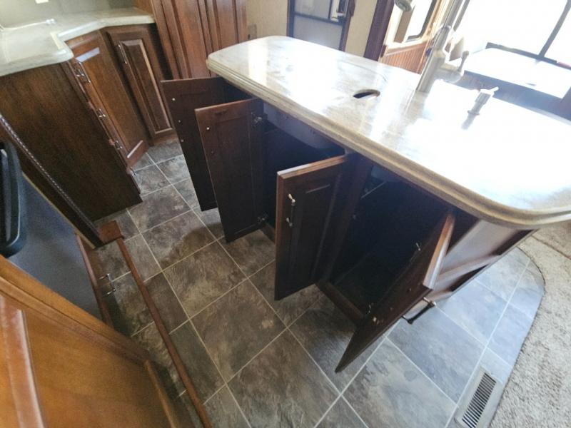 On the opposite side you will find a sofa sleeper hide-a-bed, refrigerator, and three burner range slide out. There is also a corner counter area off to the side with curio cabinets above. The kitchen island is where the double kitchen sink is located, and it provides a bit more counter space on either side.