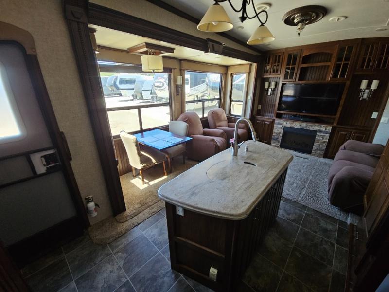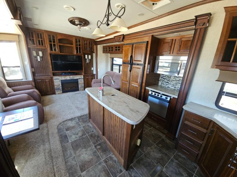 This rear entertainment Keystone Alpine fifth wheel 3010RE features triple slides, a king size bed, and a convenient kitchen island.