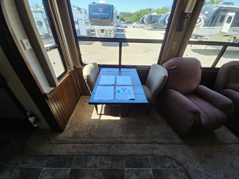 Step inside and see how open the combined kitchen and living area is with dual opposing slides. There is a free standing dinette with four chairs and a space for two additional lounge chairs in a slide to the left of the entry door.