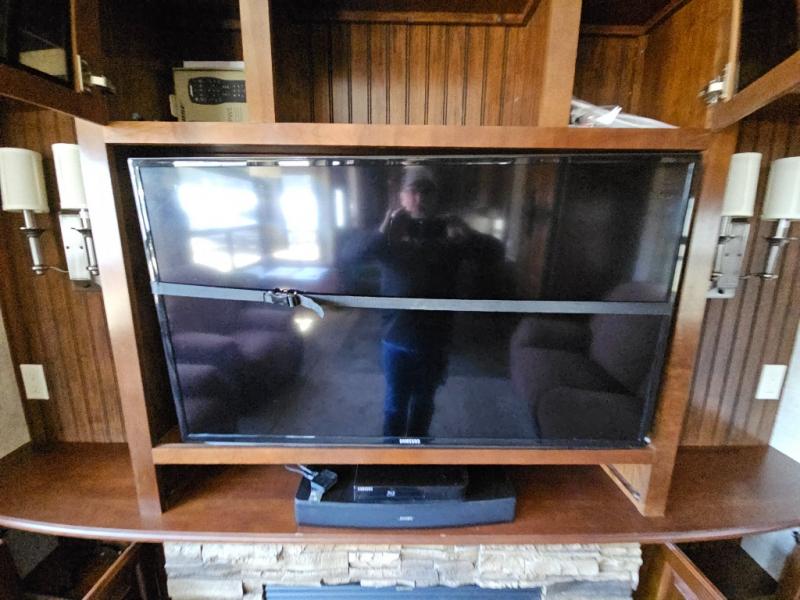 The rear wall features a full entertainment center with overhead cabinets and base cabinet storage. Not to mention the huge LED TV!