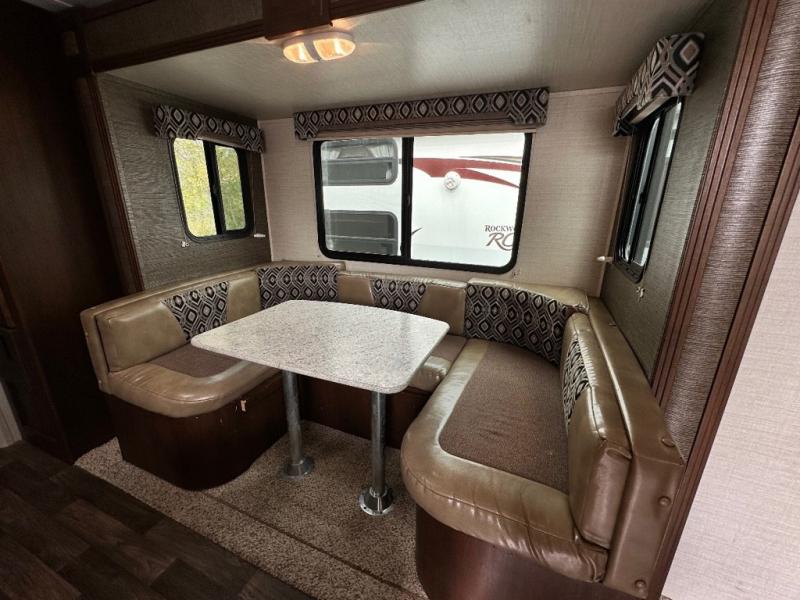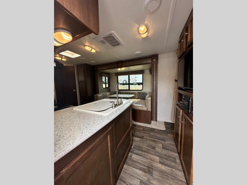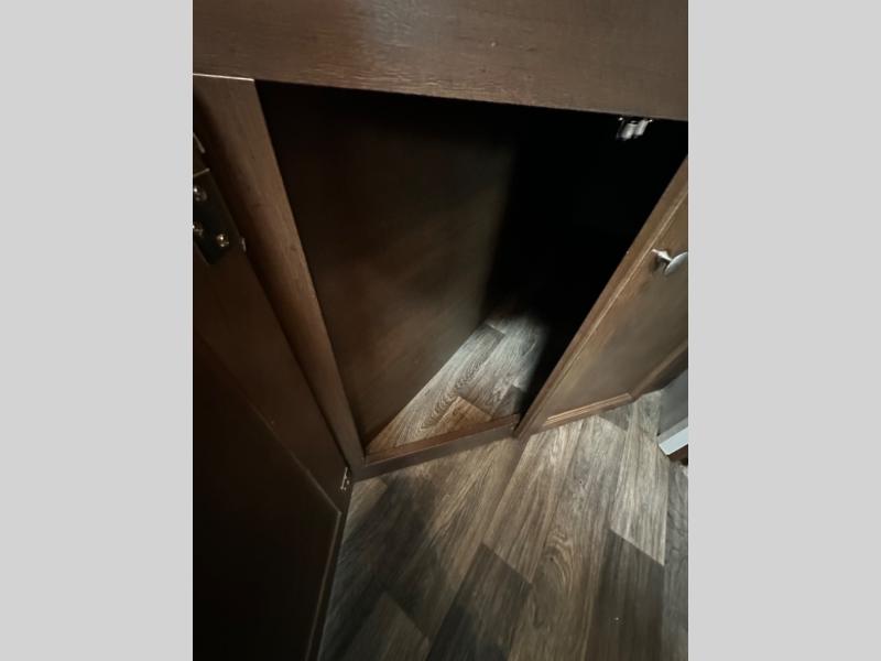 The kitchen is featured to the left of the entrance where you will find a large sink for doing dishes easily, a three burner range, overhead cabinets, and a refrigerator to keep things cold and fresh. Opposite the kitchen find a slide out u-shaped dinette. This is perfect for enjoying your meals at, and also for added sleeping space at night. A pantry/wardrobe can be found just off the dinette slide for food storage needs or clothing.