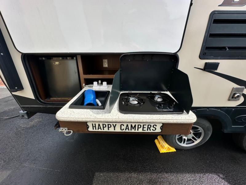 The chef in the bunch will love the outdoor cooking space with a rear kitchen beneath the double bed bunks. Here you will find a refrigerator and a two burner stove top.