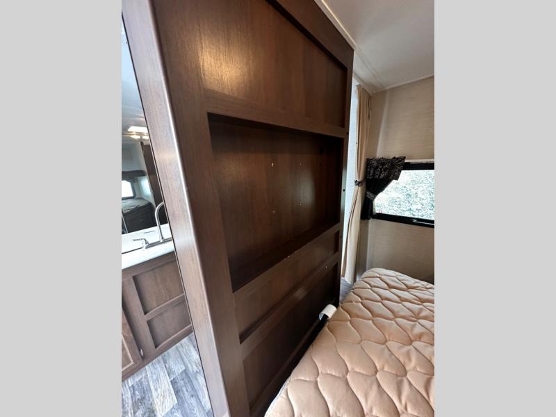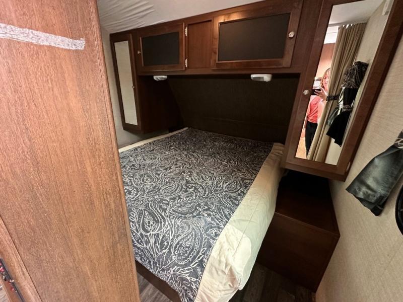 Step inside and find a queen bed up front along with dual bedside wardrobes, overhead cabinets, and a laundry chute to help keep things neat and organized. There is an entertainment center in the center just off the foot of the bed a bit, and curtains on either side that can be pulled to create a bit more privacy at night.