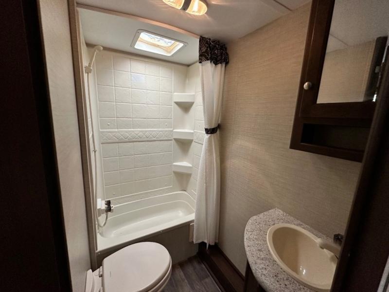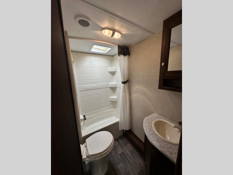 The rear of this Bullet travel trailer features a set of double bed bunks, and right next door is a complete bath with tub/shower, toilet, and vanity with sink.