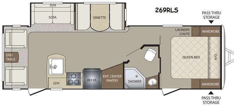 The kitchen is on your right as you step inside model 269RLS and begins with a large kitchen sink. There is also a three burner range, refrigerator, and entertainment center with pantry storage that can easily be seen from any seating in the room.