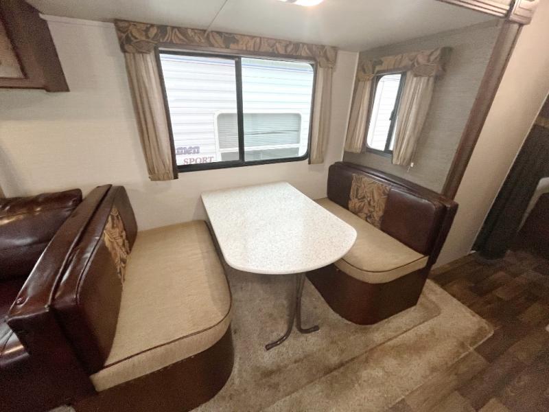 Step inside and find two swivel rockers with an end table between and overhead storage the entire width of the unit. Adjacent to the rockers find a sofa and booth dinette slide. The perfect space for enjoying your meals at, or just relaxing and hanging out.