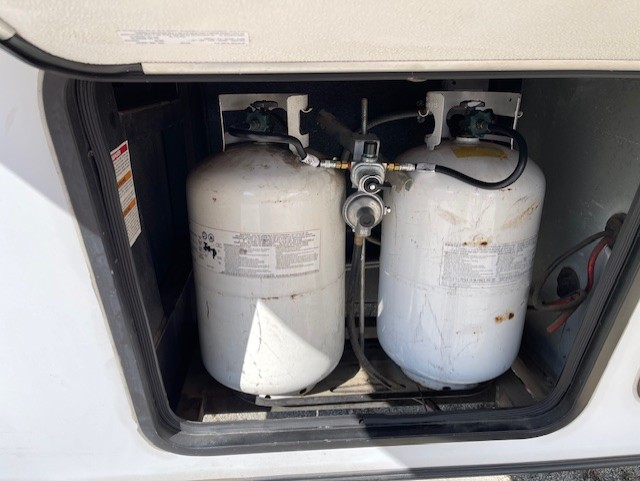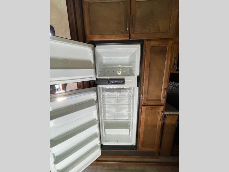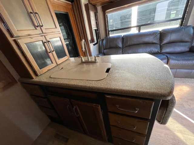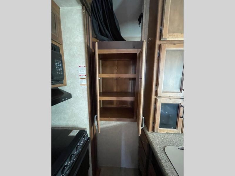 The counter peninsula provides plenty of space for food prep and there is even an extension on the end. The double kitchen sink is also located in the counter peninsula with a slide out directly behind it. The slide features a three burner range, pantry and refrigerator, plus microwave oven. There is a second pantry conveniently located off to the side of the slide.