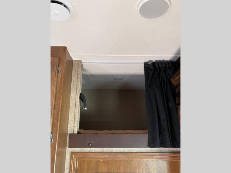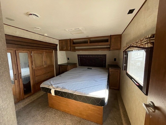 Continue down the hall to the front bedroom featuring a queen bed, dual nightstands, and overhead storage cabinets. There is a large wardrobe slide out which provides a bit more space to move about, and plenty of storage for all of your clothes. There is a second small wardrobe with a laundry chute opposite the bed against the bathroom wall.