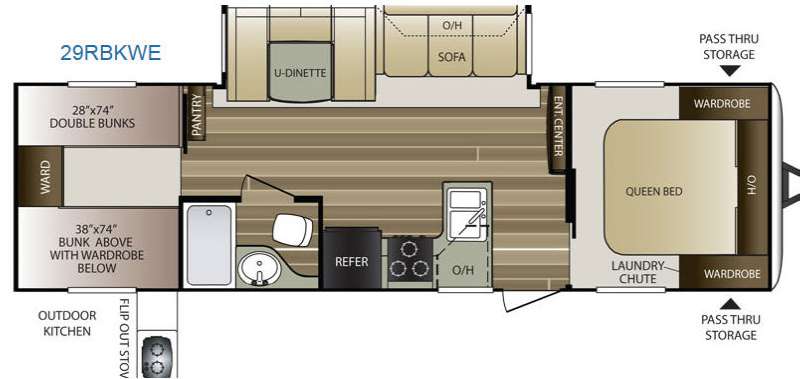 A bath can be found just beyond the kitchen area providing your family a tub/shower, toilet and vanity with sink. There is also a pantry for added storage located near the dinette slide just outside the rear bunkhouse door.