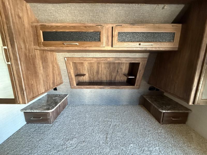 Continuing inside there is an entertainment center along the interior living area wall which features storage both above and below a space where you can add an optional 32" TV for enjoyment.