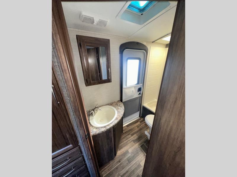 The rear left corner provides a complete bath with tub/shower, toilet and sink, plus an exterior entry door for added convenience when accessing from outdoors. There is also a wardrobe for clothing storage just outside the bathroom door.