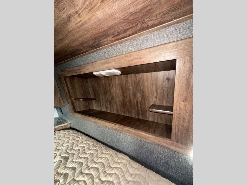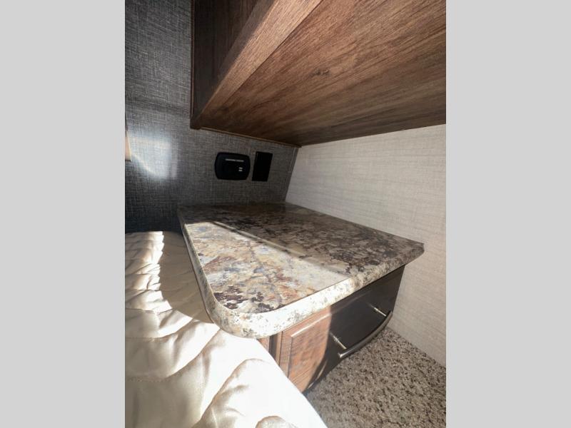 What I liked most: Good size passed through storage in front. Power jacks all around. Quite a bit of rear exterior storage with two access points. Nightstands and electrical outlets in each of the bunk areas.