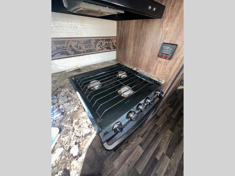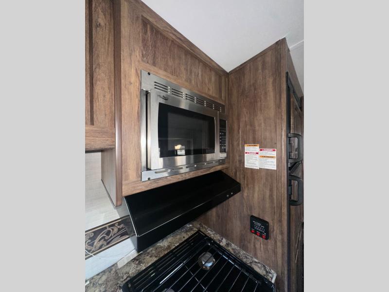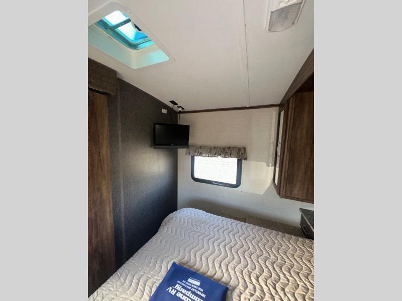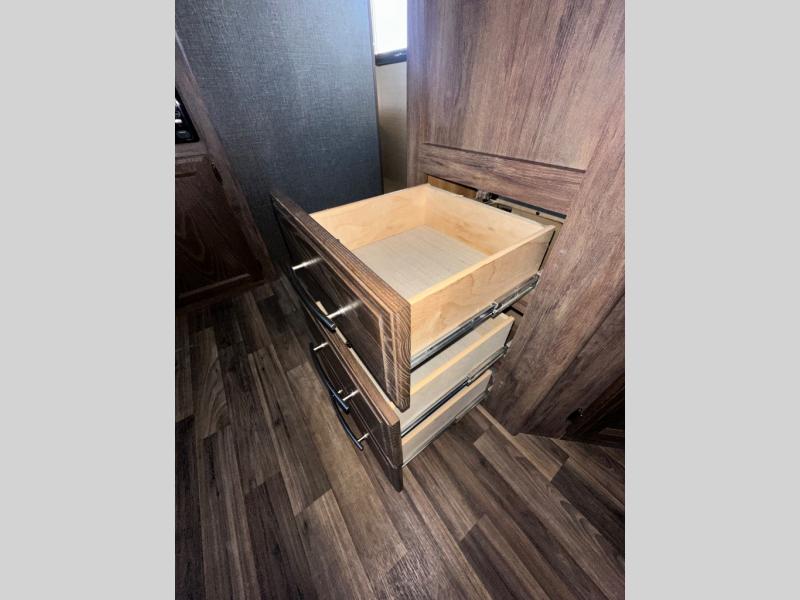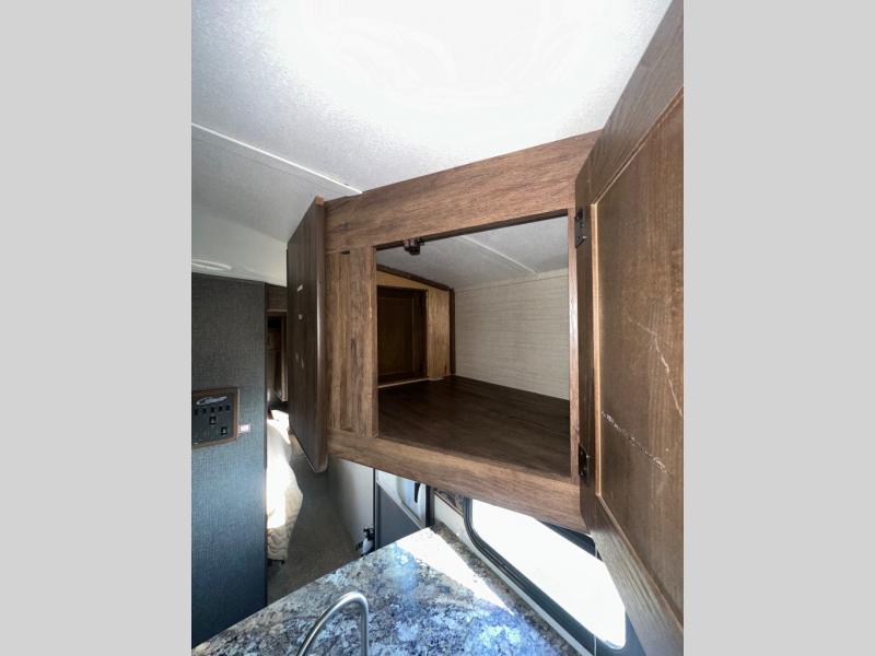 An entertainment center is straight in from the door. It can easily be viewed when seated at the U-shaped dinette and hide-a-bed sofa slide each featuring overhead storage and extra sleeping space if needed.
