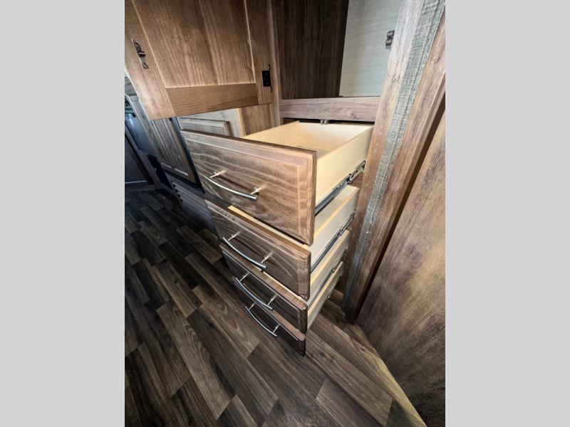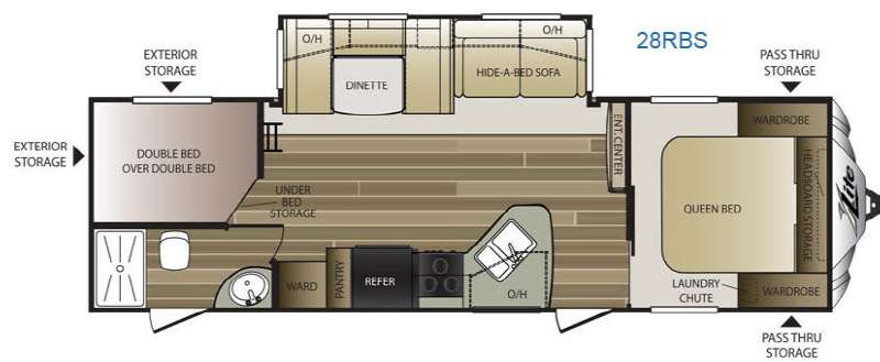 Besides storage, model 28RBS offers double bed bunks, convenient dual entry doors, and a large slide, plus sleeping for TEN!