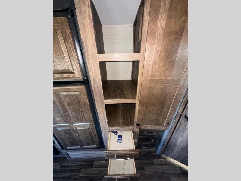 Enter the front most door and notice the master bedroom to the right just inside the sliding bedroom door. There is a queen bed, dual bedside wardrobes, headboard storage, and a convenient laundry chute.