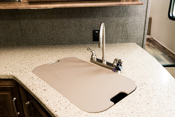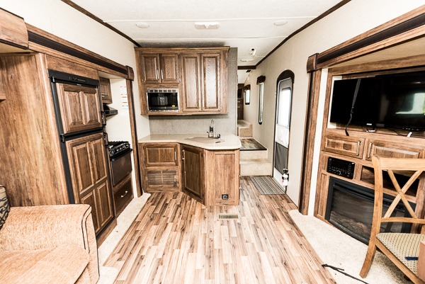 There is a hide-a-bed sofa, refrigerator, and three burner range slide opposite the door side, plus additional counter space along the interior wall that features plenty of prep space and includes a double sink, and overhead storage.