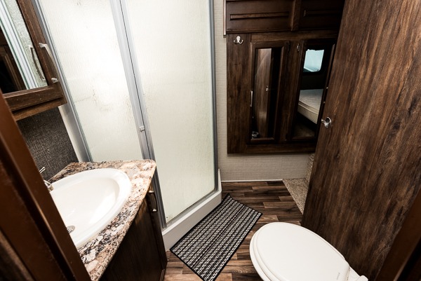 Step up to a front bed and bath area. The bath area features a neo-angle shower, toilet, and sink with overhead cabinet. There is also a linen cabinet which is accessible in the bath when the linen/wardrobe slide is fully extended. There is a second sliding bath door that leads directly into the bedroom for added convenience.
