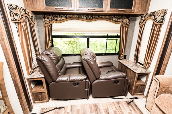 Along the rear wall find two swivel rocker recliners with an end table between, plus overhead storage the entire width of the unit.