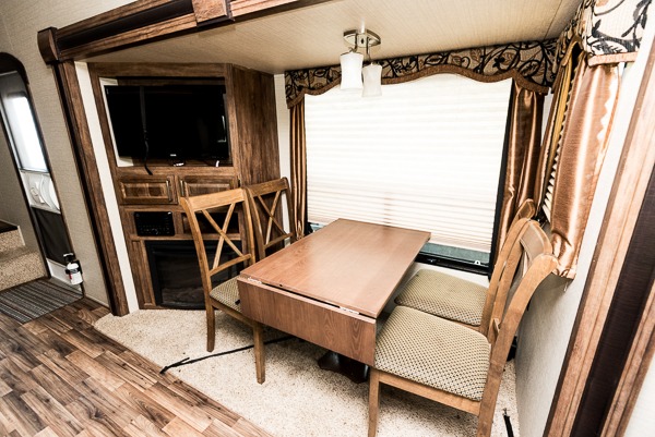 Entering model 28SGS takes you right into the combined kitchen and living room space. There is a slide out entertainment center/pantry, and free standing dinette with four chairs.