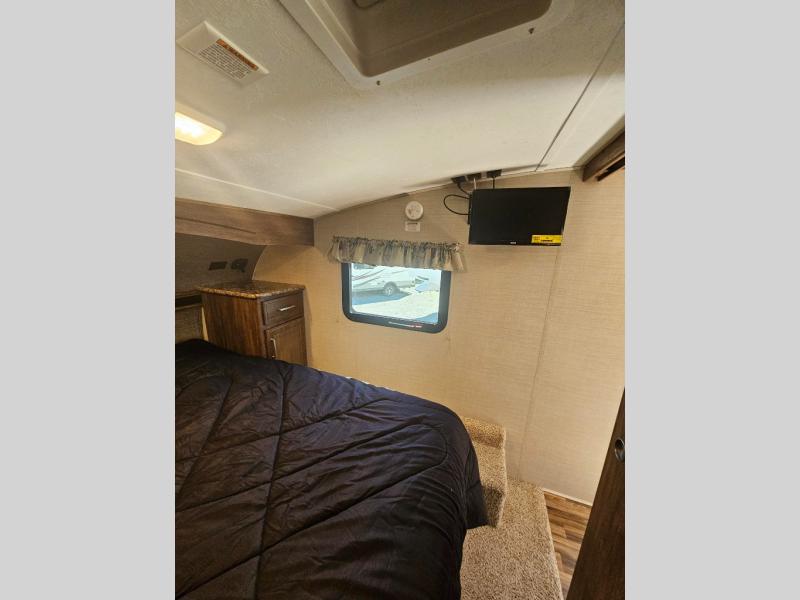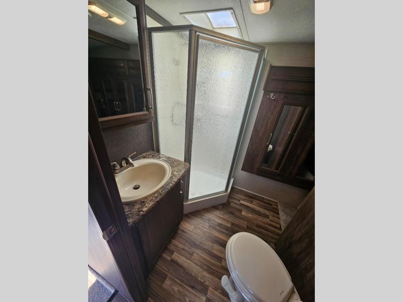 Step up to a front bed and bath area. The bath area features a neo-angle shower, toilet, and sink with overhead cabinet. There is also a linen cabinet which is accessible in the bath when the linen/wardrobe slide is fully extended. There is a second sliding bath door that leads directly into the bedroom for added convenience.