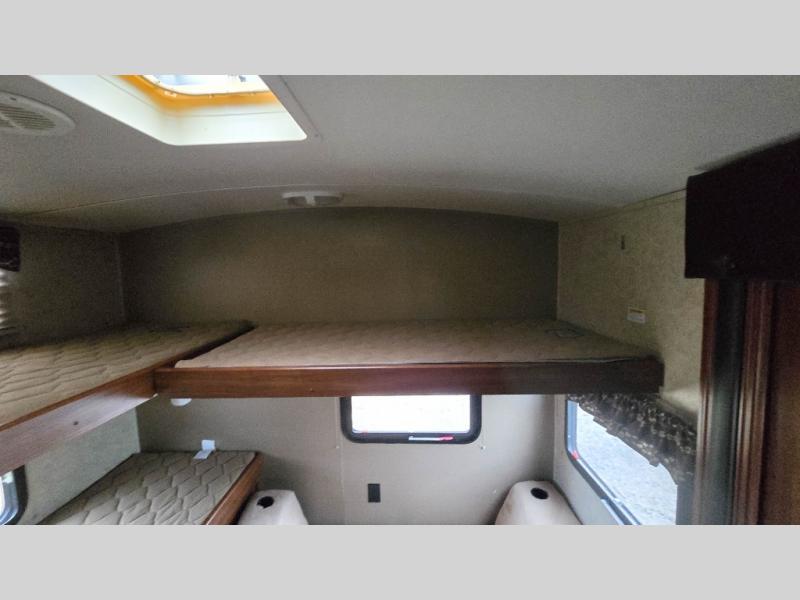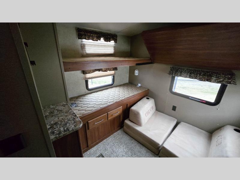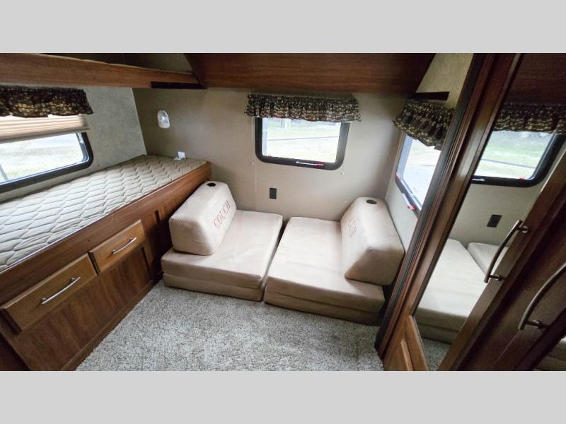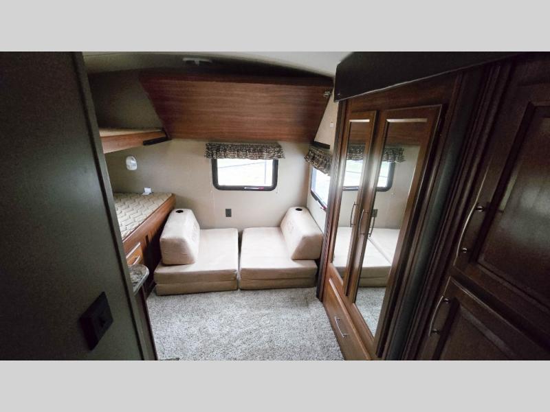 The rear is where you will most likely find the kids hanging out when they are not enjoying the outdoors. There is a large wardrobe slide on the right as you enter. A cub coach straight ahead with a flip-up bunk above, and a set of 28" x 74" bunks on the left side. There is also a 19" LCD TV mounted on the wall for enjoyment.