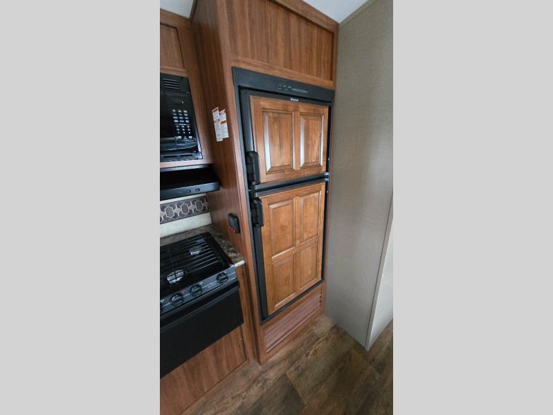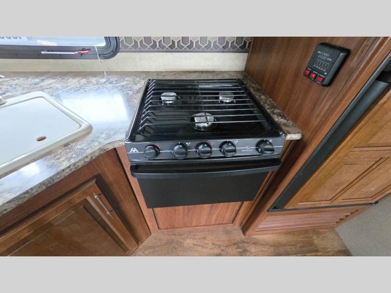 Outside the family chef will enjoy cooking and grilling with a handy refrigerator, counter top, single sink, and two burner stove top at the pull-out exterior kitchen in the rear. The front offers a pass-through storage compartment that is perfect for all of your outdoor gear, and so much more!