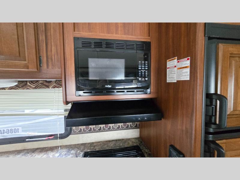 On the opposite side of the slide there is a kitchen where you can easily whip up a meal or snacks for your hungry crew. There is a refrigerator, three burner range, microwave oven, and double kitchen sink too. Plus a pantry located just off the dinette slide for storing all of your dry and canned goods.