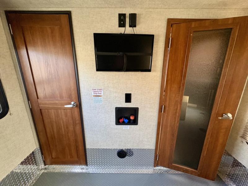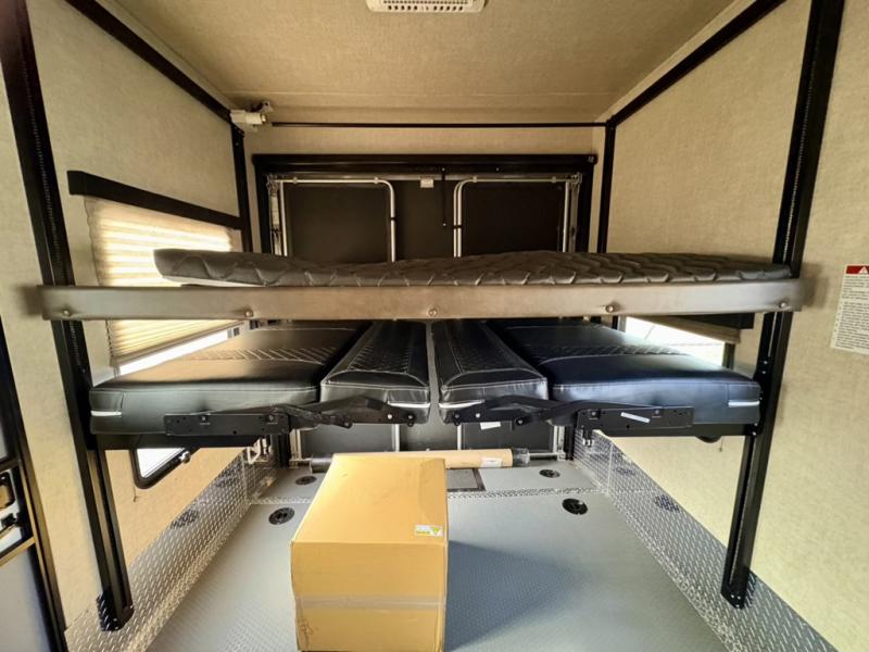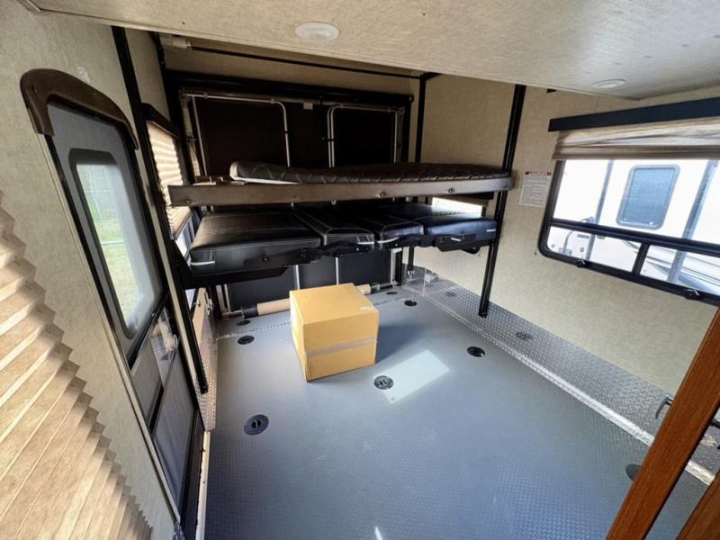 Loading and unloading is a cinch with the 8' garage door. Once you are at your destination and the toys are removed the garage becomes a part of the living space if you add the optional dual opposing sofas with a top queen bed that lowers from the ceiling for more sleeping space inside. There is also a loft area toward the front of the garage space that the kids will surely love. Enjoy the convenience of a half bath in the cargo, and washer and dryer prep also.
