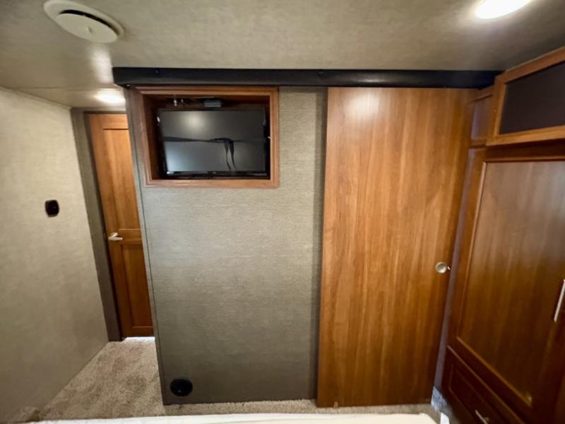 The front bedroom features a residential queen bed or optional king. There is a flat screen TV mounted on the wall. There is storage on either side of the bed plus an overhead cabinet too. Enjoy plenty of additional storage with a slide out wardrobe that includes the bath linen cabinet also.