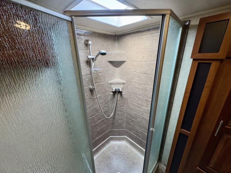 Head up the steps to the front bed and bath. The side aisle bath features dual entry doors from the hall and from inside the bedroom. There is a shower, toilet and vanity with sink, plus a linen cabinet that is included in the bedroom slide.