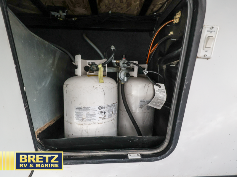 Enter the main living area and find a slide out sofa, convenient pantry, L-shaped counter featuring the double kitchen sink. There is a slide out three burner range, 12 cu. ft. refrigerator, and entertainment center with 48" TV and fireplace. Enjoy dining at the hi-top pub table with three bar chairs.