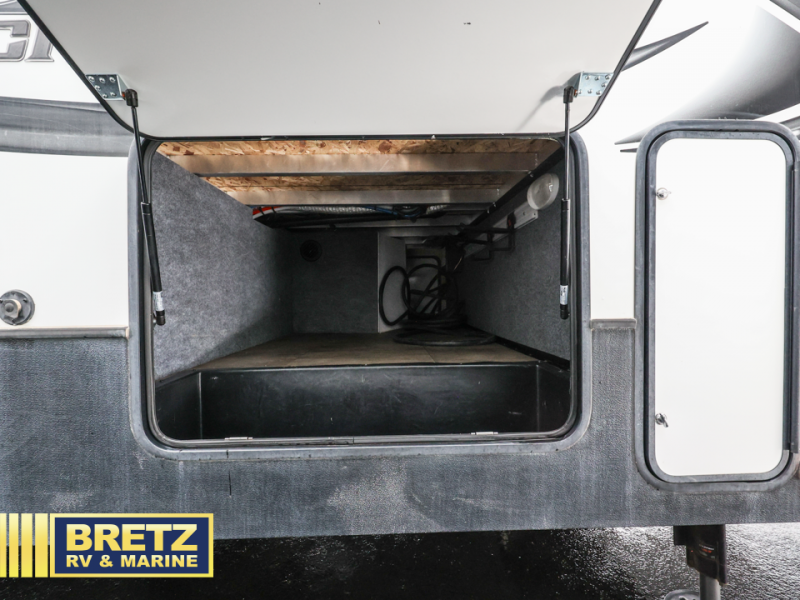 At your destination, and once the toys are removed, you will find additional living space where you can add optional dual opposing sofas and a queen bed that drop down from the ceiling. There is also a loft, washer/dryer prepped space, and a half bath plus cargo TV.