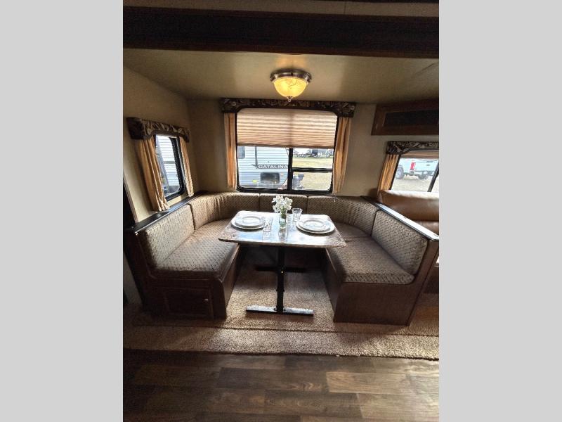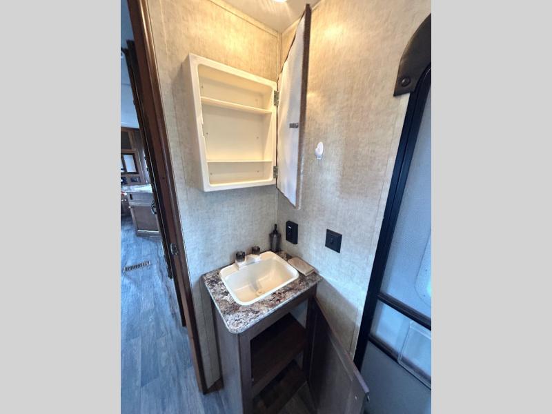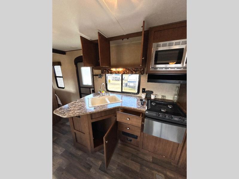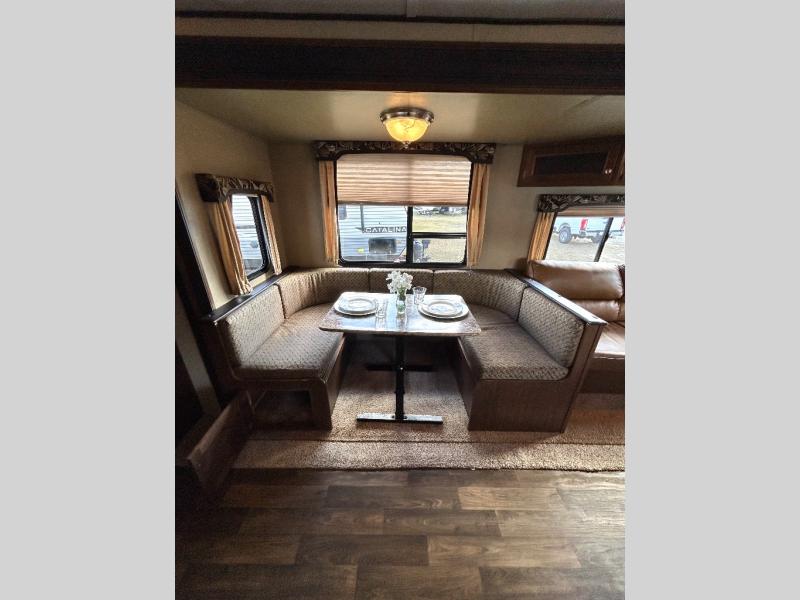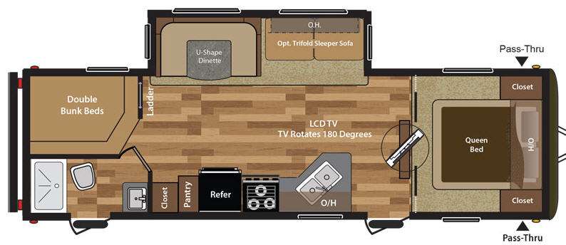 The main area features a large slide out optional tri-fold sleeper sofa and u-shaped dinette providing plenty of seating and extra sleeping space too. Across from the slide there is the kitchen area where you will find a pantry, refrigerator, three burner range, and double kitchen sink. Plus plenty of overhead storage cabinets as well.