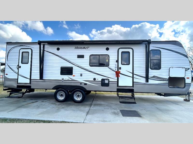This Keystone Hideout travel trailer has plenty of space for a larger family, or one that likes to travel with guests. Model 28BHS features a large slide, double bed bunks, dual entry doors, and more!