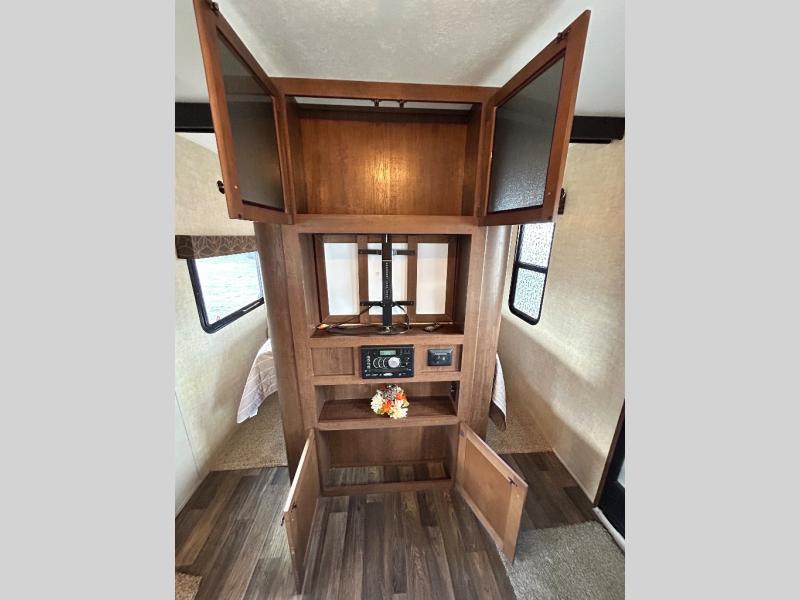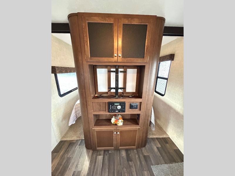 Enter the door located furthest to the front of the trailer featuring a front bedroom with queen size bed just inside the door. There are closets on both sides of the bed, plus in an overhead cabinet above the head of the bed. You will also enjoy the entertainment center just off the foot of the bed that swivels to provide television viewing in multiple locations, including the bedroom. Use the curtains on either side to provide a bit more privacy at night if you wish.