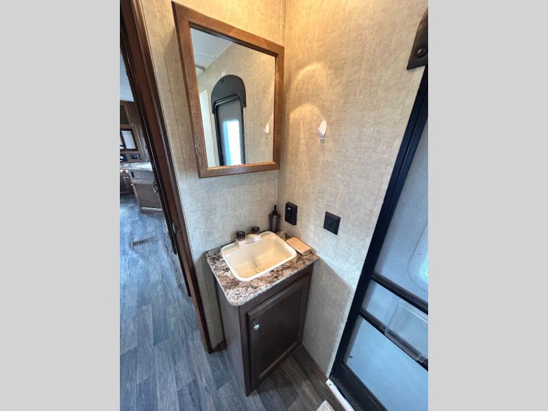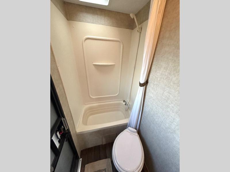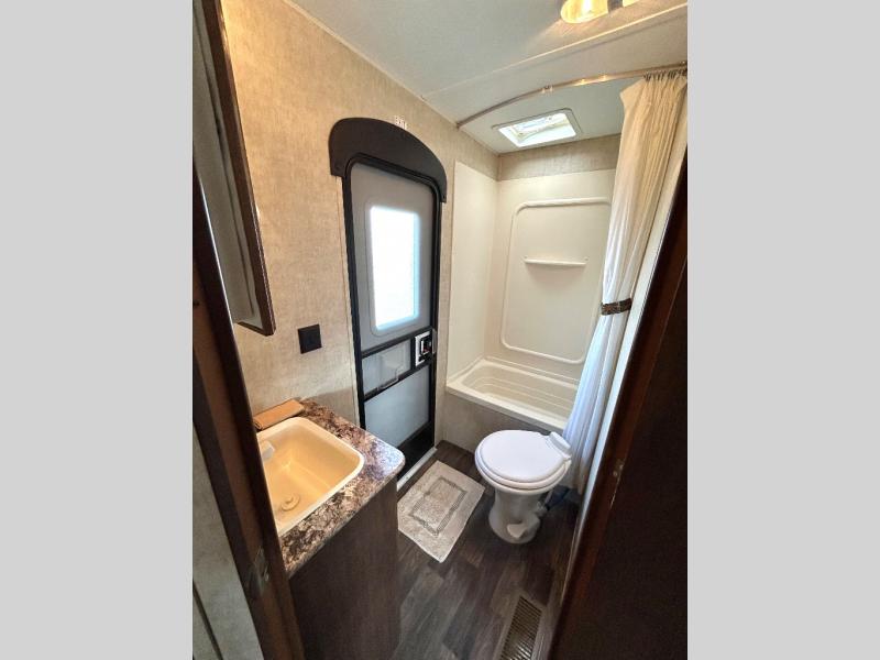 Along the back there is sleeping for four with double bed bunks in the right rear corner. A ladder is included for easy access to the top bunk. The rear left corner offers convenient bath amenities including a tub/shower, toilet, and sink, plus private entry for easy access when enjoying the great outdoors!