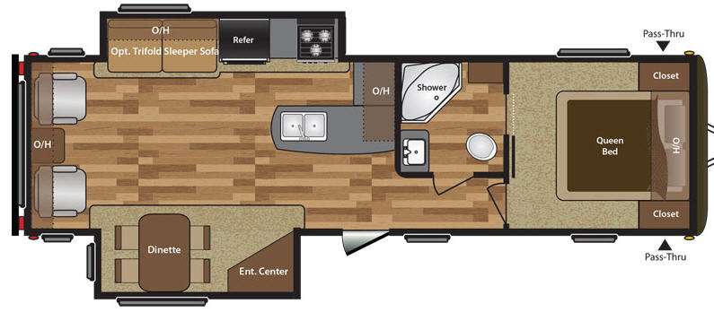 There is a front pass-through compartment for storing all of your exterior camping gear. And, you may add an optional tri-fold sleeper sofa in place of a standard sofa if you like.
