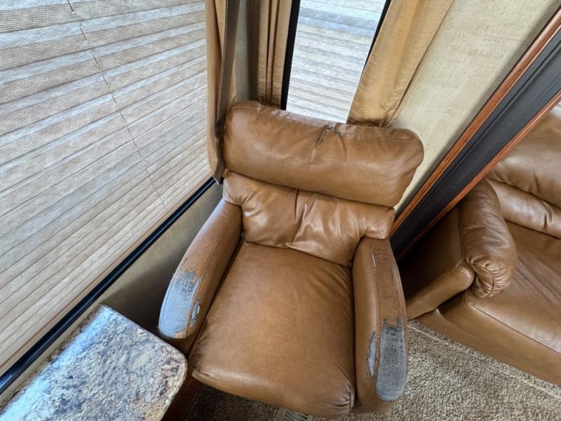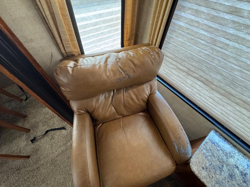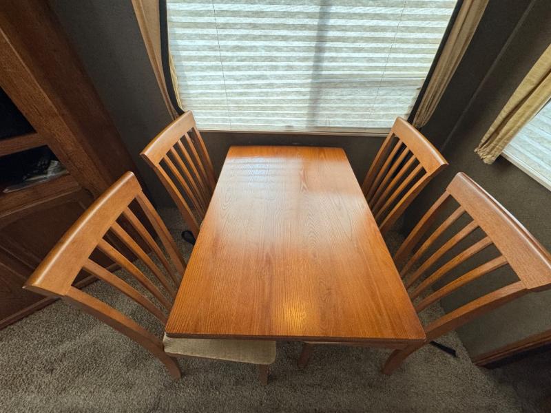 The rear of this Hideout unit features two lounge chairs with an end table between and overhead cabinets the entire width of the trailer. Along the curb side there is a slide out dining table with four chairs and a corner entertainment center for your enjoyment just to the left of the side entry door.