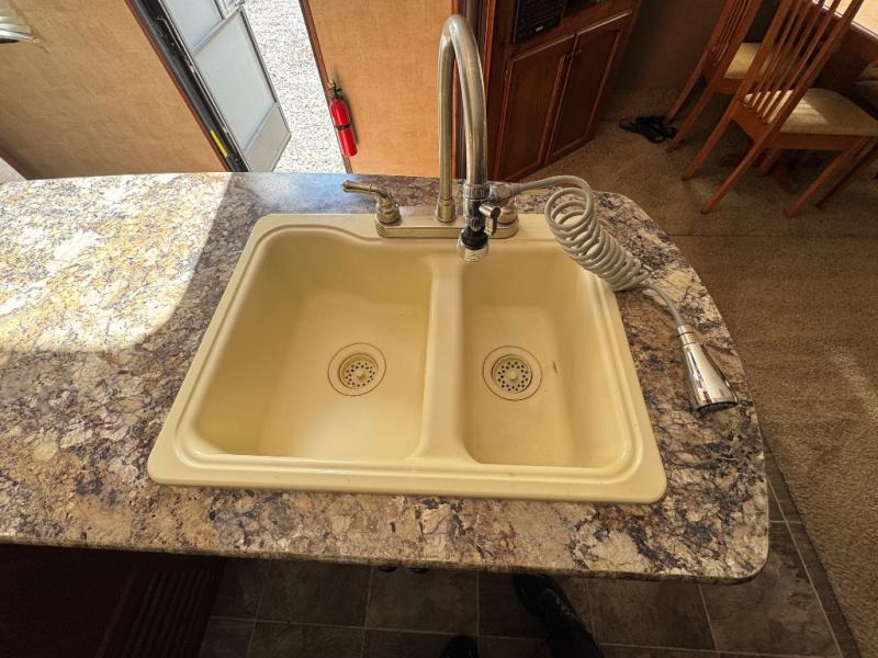 Step inside and find a L-shaped counter straight ahead. There is a double kitchen sink, overhead storage, plus drawer and cabinet space for pots and pans below. The slide behind the counter features a three burner range, pantry and refrigerator, plus a sofa with overhead storage as well.