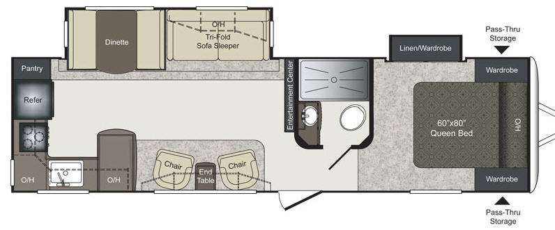 As you enter model 294RK there is a bathroom almost directly across from the door that features a shower, toilet, and vanity with sink. Further to the right is a spacious master bedroom with queen bed, bedside wardrobes, and a linen/wardrobe slide. You will also find overhead cabinets above the bed for added storage.