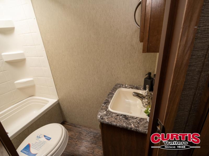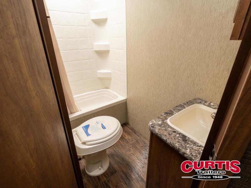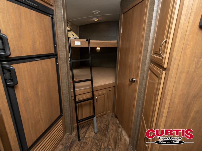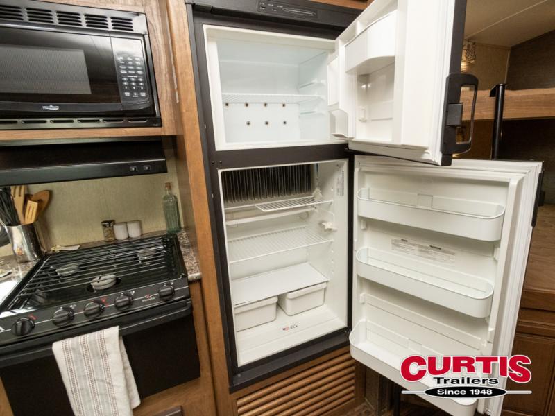 In the very rear of this Laredo LHT model find a set of double bed bunks in the left side corner with the outer edge angled to provide more room to move around. There are curtains that can be pulled to give your campers a bit more privacy when they turn in for the night.