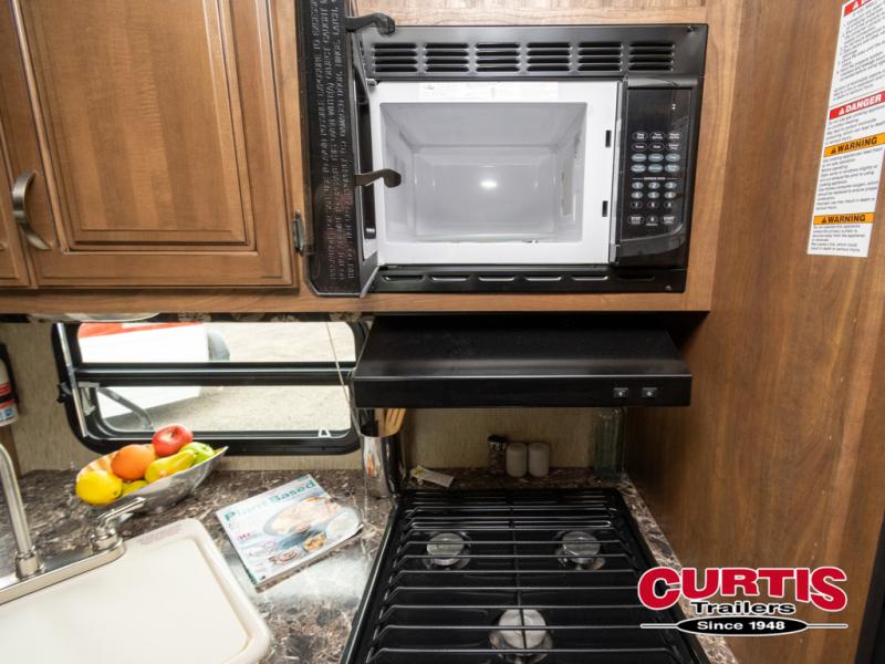 On the outside you will enjoy using the pull-out camp kitchen when you want to dine outdoors in the fresh air. There is a two burner cook-top, a single sink, and bumper mount grill, plus overhead storage.