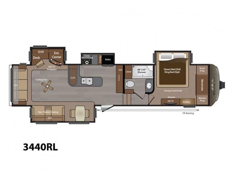 Camping will be fun in this Keystone Montana 3440RL fifth wheel. This unit offers a rear living layout with quad slide outs, a king bed option, and fireplace!