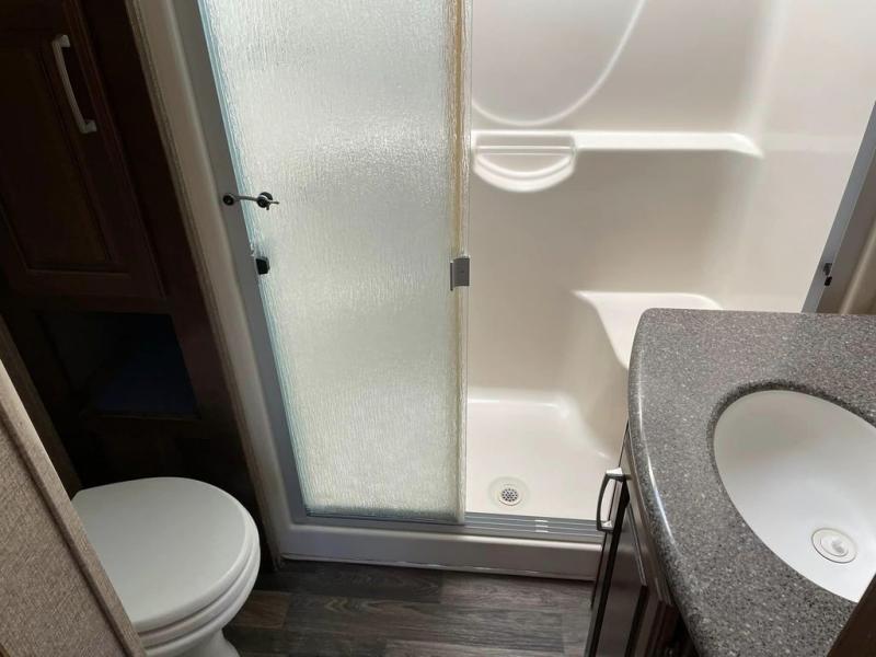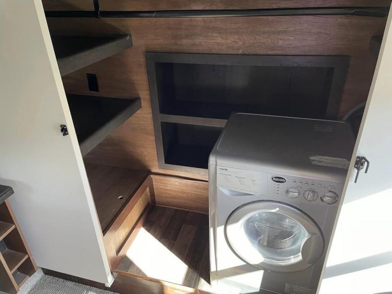The front bedroom offers plenty of space to rest and relax from a fun filled day. Inside find a queen bed slide out or optional king if you enjoy a bit more sleeping space. You will also find storage beneath the bed for larger items and extra bedding. A dresser can be found opposite the bed with an HD TV above, and seating along side following that curb side wall. There is also a front wall wardrobe and a space prepped for a washer and dryer to the right and left of the wardrobe, plus so much more!