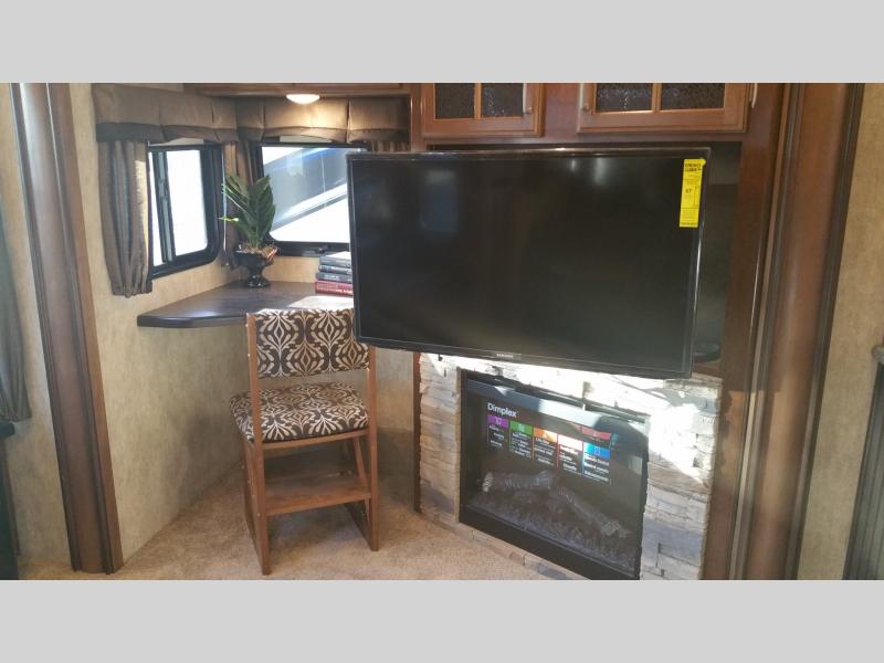 The rear wall offers a seating area with a sofa and more overhead cabinet storage the entire width of the room. There is a second living room slide adjacent that features a desk and entertainment center, overhead cabinet, HD TV, and fireplace.