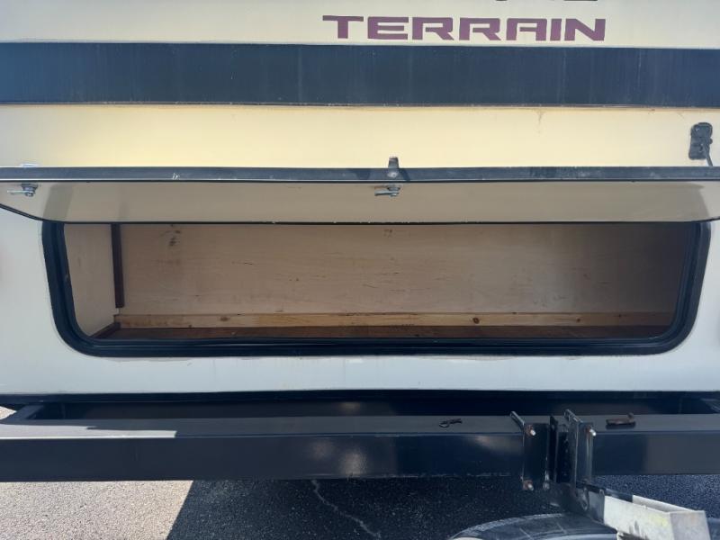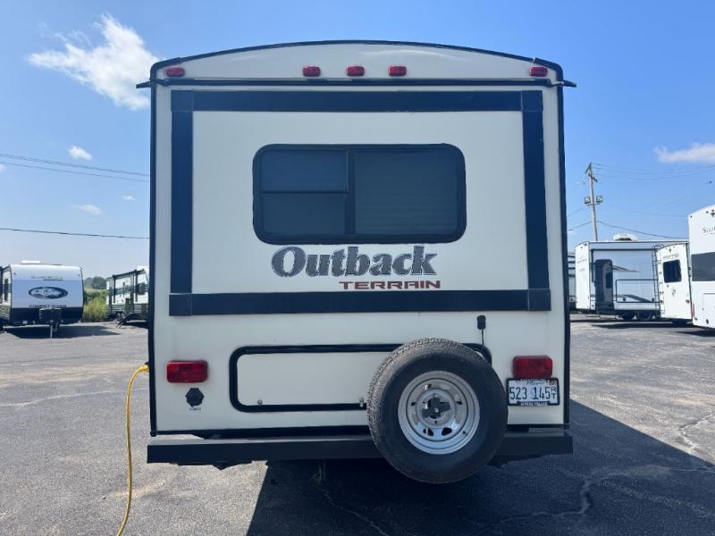 This Outback Terrain Ultra Lite travel trailer 250TRS by Keystone features a set of bunks, a rear king bed slide, a king dinette, and an outside kitchen too!