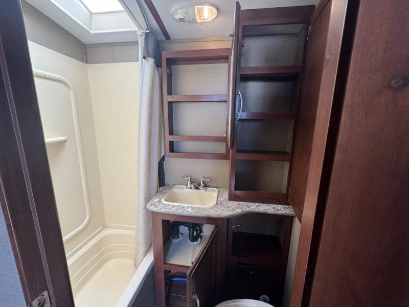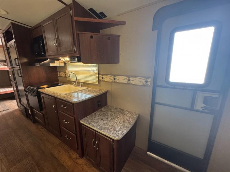 Beyond the kitchen you will find a sofa and LCD TV before you get to the rear king bed slide just inside the rear side entry door. There is plenty of storage with overhead cabinets, and exterior storage beneath the slide also.